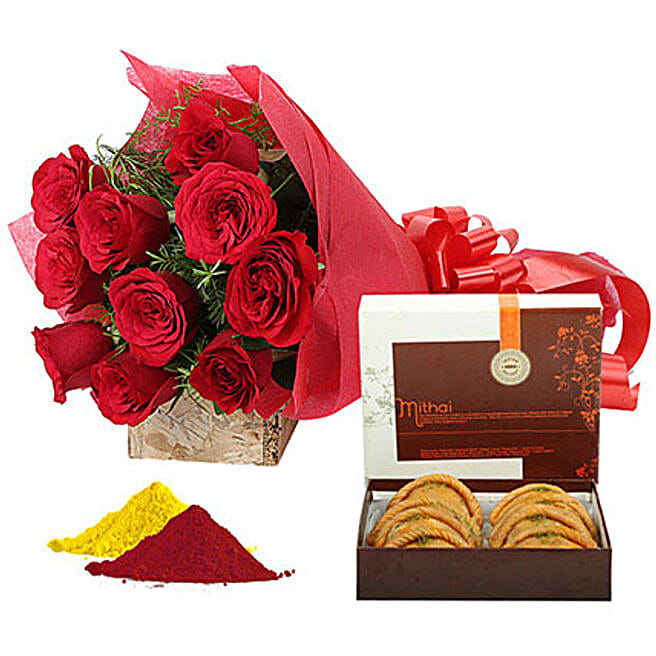 This classic combo is perfect for the one who wants to gift their loved ones the essence of customs and traditions of the Holi festival. The lip-smacking gujiya, fragrant roses, and different shades of gulal can entice anyone to play Holi with great enthusiasm and get immersed in the colours of joy and happiness.