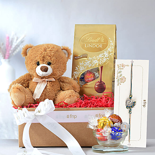 Ethnic Peacock Rakhi with Lindt & Teddy Bear