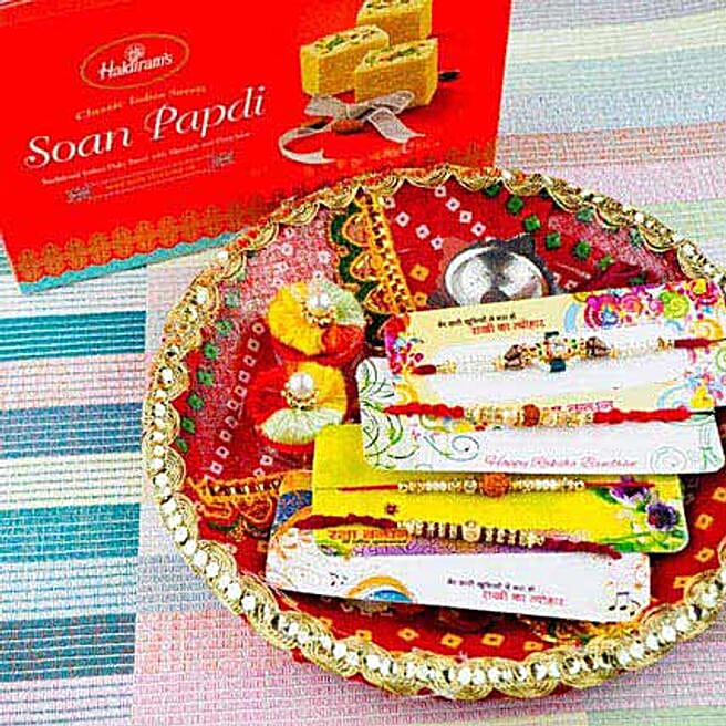 Four Rakhi Set With Soan Papdi and Traditional Thali