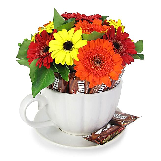 Heavenly Mixed Gerberas Teacup And Tim Tams
