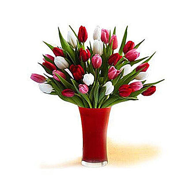 30 Red White Pink Tulips In A Glass