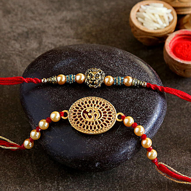 Lion Face And Auspicious Om Pearl Rakhi Set