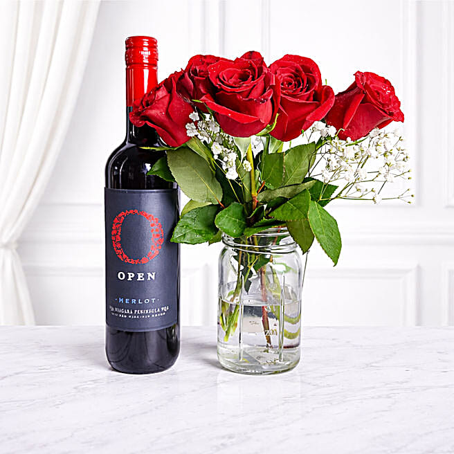 Red Roses Bunch And Red Wine