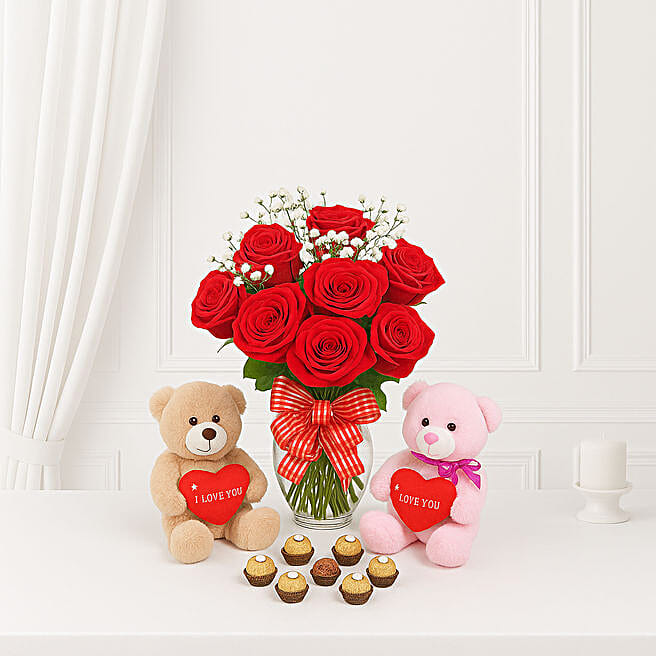 Red Roses Bunch With Teddy Bears And Ferrero Rocher