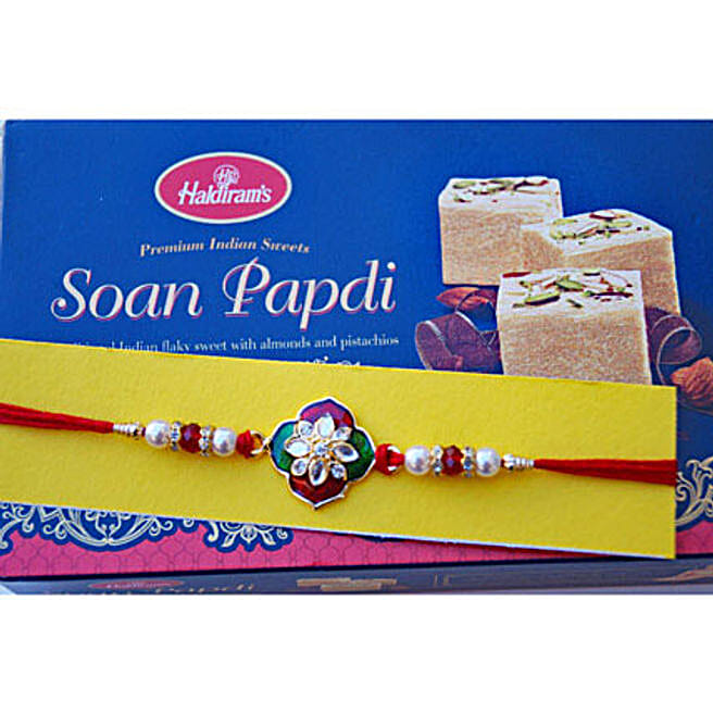 Zardozi Floral Rakhi with Soan Papdi