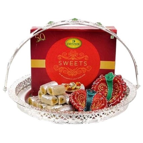 500 grams of kaju roll and two red and green diyas packed in a round silver basket.