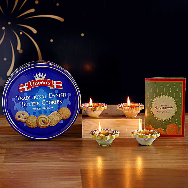 Set O 4 Beautiful Diyas And Danish Butter Cookies