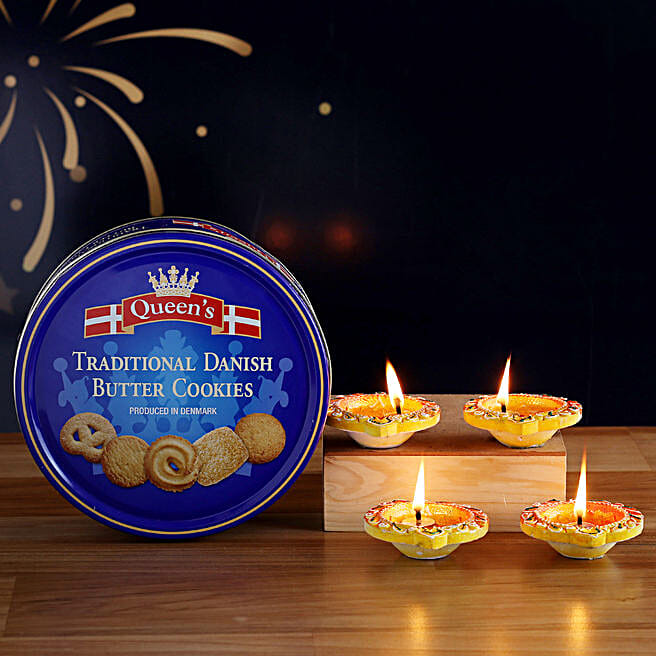 Set O 4 Designer Diyas And Danish Butter Cookies