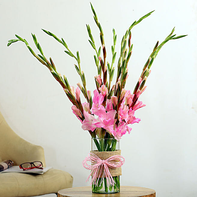 10 Pink Sprayed White Glads In Cylindrical Vase