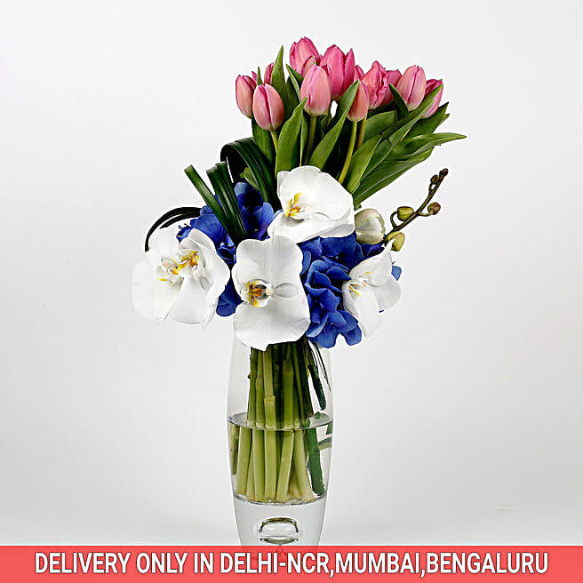 20 Unique Pink Tulips Hydrangeas Premium Glass Vase Arrangement