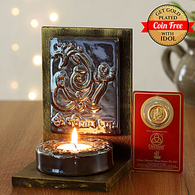 24 Carat Gold Plated Coin Free With Ganesha Tealight Holder Brown