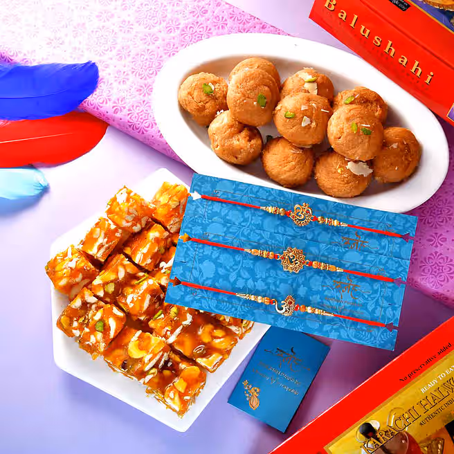 3 Metallic Om Rakhis With Karachi Halwa & Balushahi