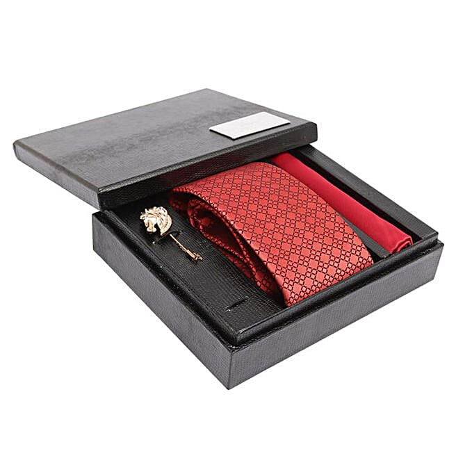 Alvaro Castagnino Red Necktie Pocket Square & Lapel Pin in Crocodile Box for Men