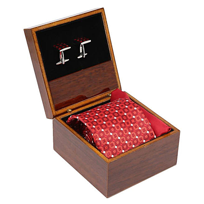 Alvaro Castagnino Red & White Necktie Cufflinks And Square Pocket Gift Set for Men