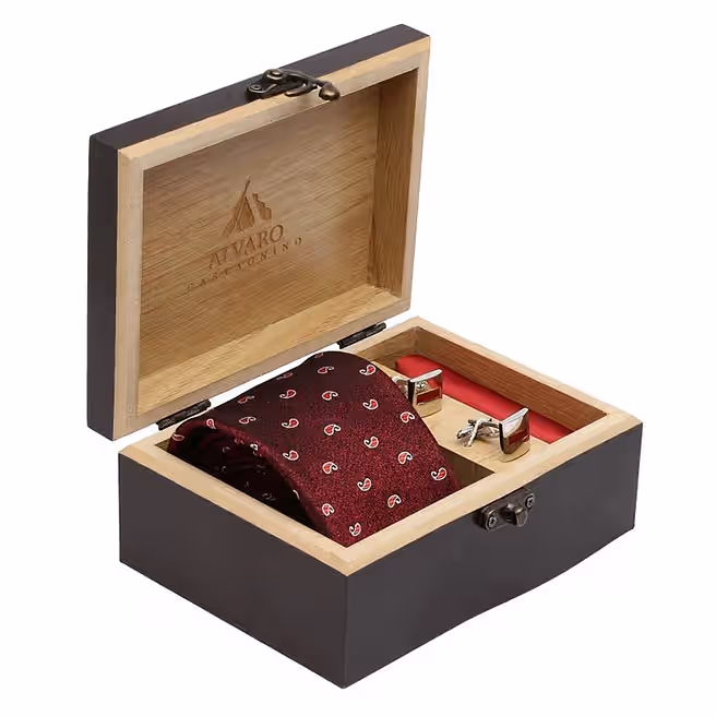 Alvaro Castagnino Silver & Maroon Necktie Pocket Square And Cufflinks in Kunda Box for Men