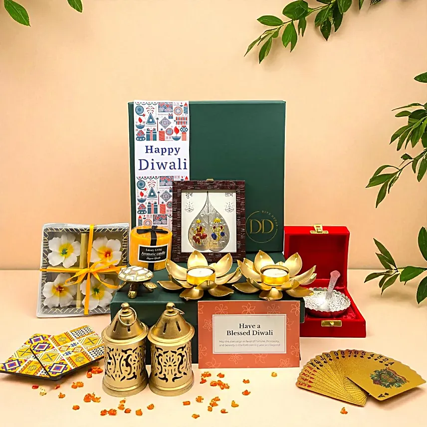 Illuminate their Diwali celebrations with this enchanting gift hamper a perfect blend of tradition and elegance. At its heart lies a Wish Tortoise symbolising prosperity and good fortune accompanied by a silver plated Laxmi Ganesh frame to bless their home. Golden playing cards and exquisite tea lights create moments of joy while scented and pillar candles cast a warm glow. Ideal for loved ones who cherish festive magic this hamper transforms every corner into a sanctuary of peace and celebration.