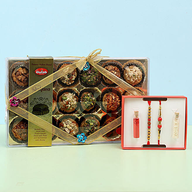 Baklava in Crystal Box & Set of 2 Rakhis