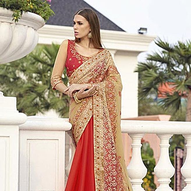 Beige Colored Embroidered Faux Georgette Net Partywear Saree