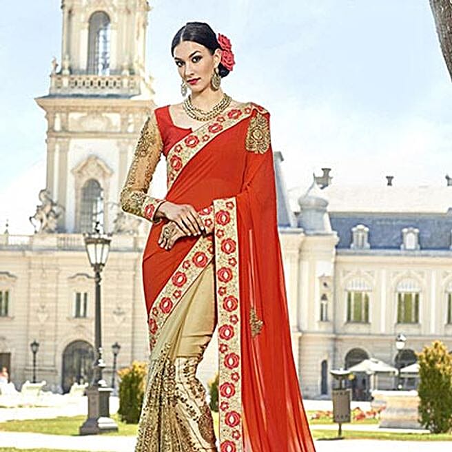 Beige Georgette Net Half N Half Embroidered Saree