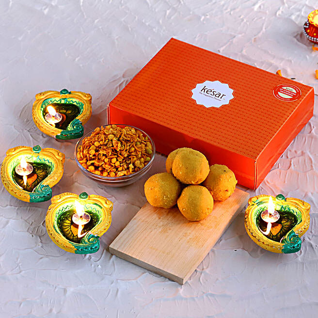 Besan Laddoo & Navratan Mixture With Designer Diyas