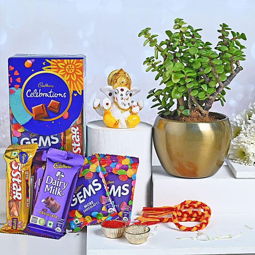 Celebrate the special bond on Bhai Dooj with our unique combo! This delightful gift comprises delectable chocolate, a Jade plant, a multicoloured Ganesha idol and other festival essentials. The mauli and the Ganesha idol symbolise blessings and protection for your brother, while the Jade plant symbolises prosperity and good luck. It's the perfect Bhai Dooj gift, harmonising sweet indulgence, greenery and tradition.