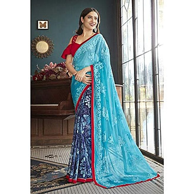 Blue Faux Georgette Embroidered Office Wear Sarees