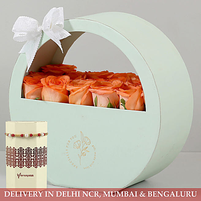 Box Of Beguiling Orange Roses & Rakhi