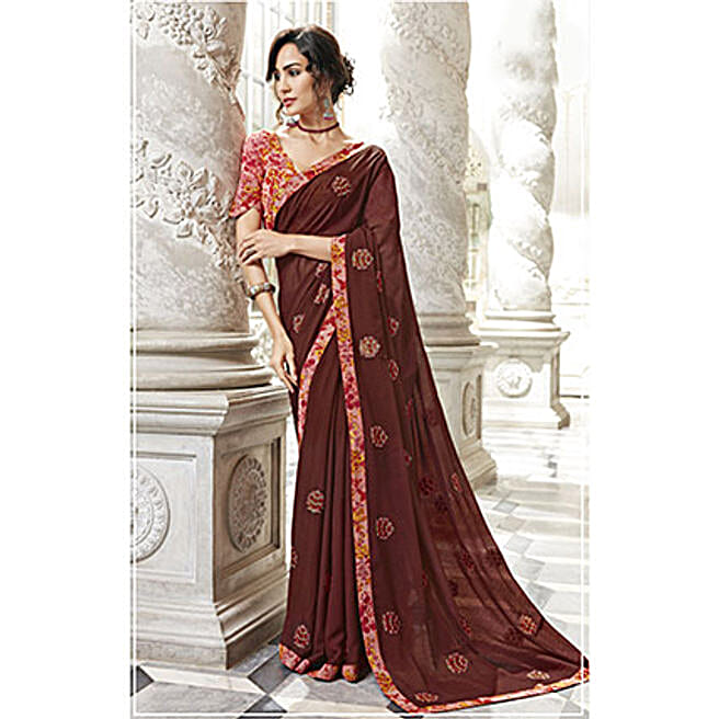 Brown Chiffon Embroidered Party Wear Sarees