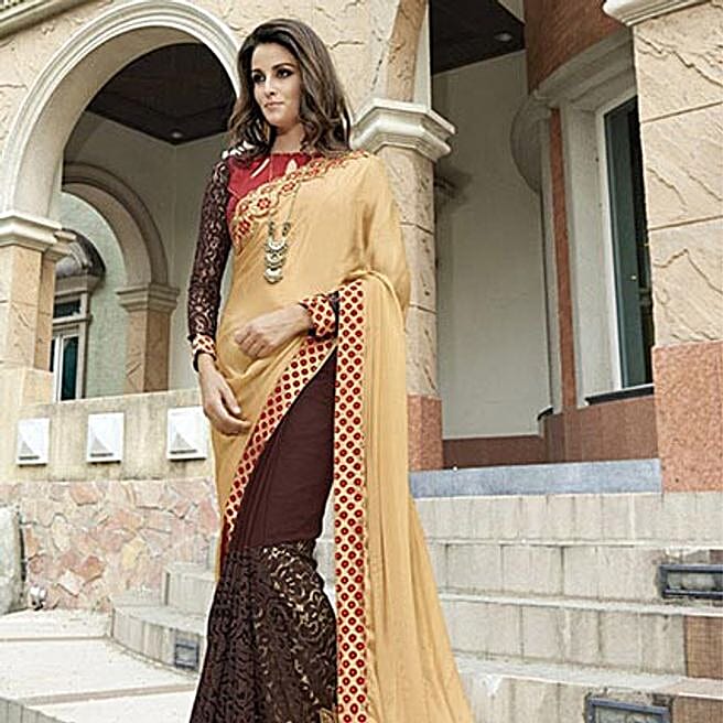 Brown Colored Embroidered Chiffon Georgette Net Partywear Saree