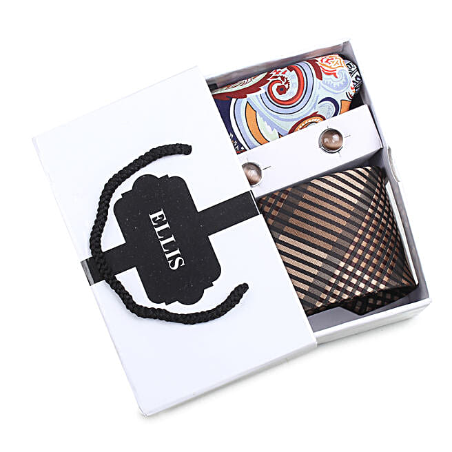 Brown Tie Pocket Square & Cufflink Set For Men