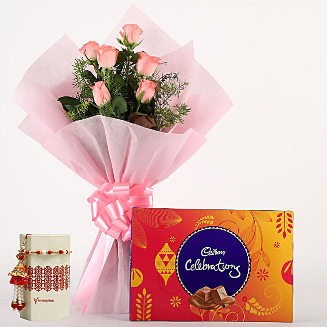 Chocolates & Pink Roses With Rakhi