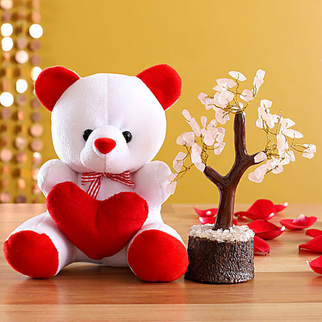 Cute Teddy Bear & Rose Quartz Wish Tree