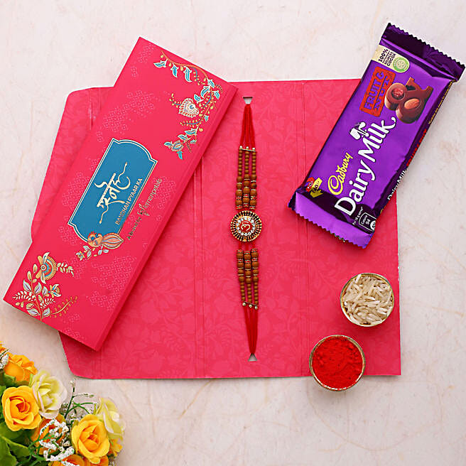 Elegant Om Rakhi and Dairy Milk Fruit N Nut Chocolate