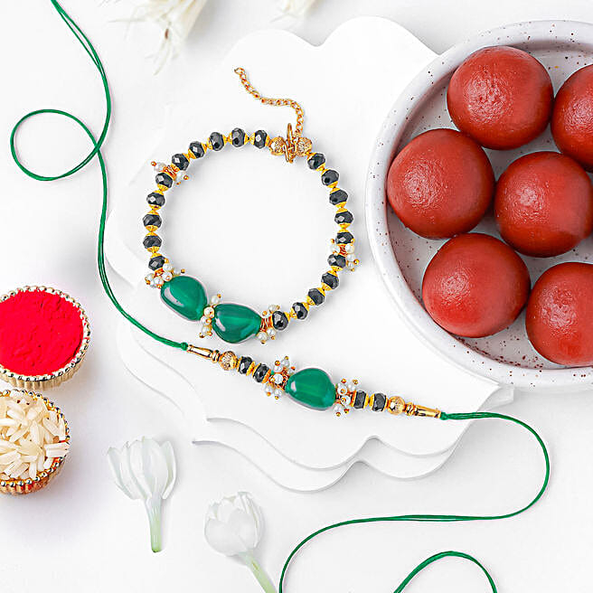 Enchanted Stone Work Lumba Pearl Rakhi Set & Sweet Treat