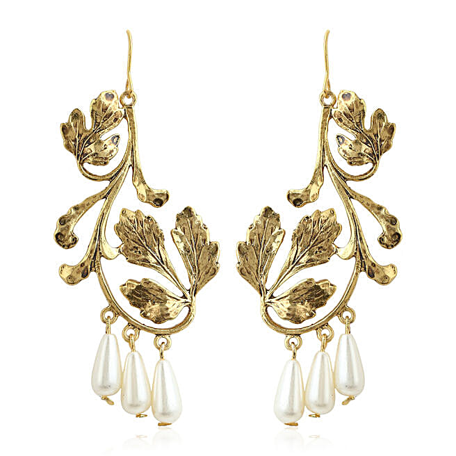Estele Gold plated Leafy Pearl Drop Earrings