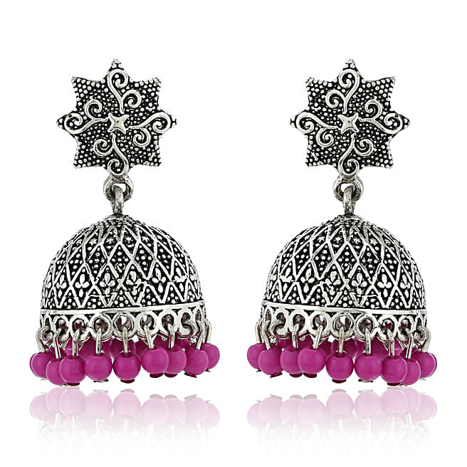 Estele Oxidised Silver Plated Red Beads Jhumkis
