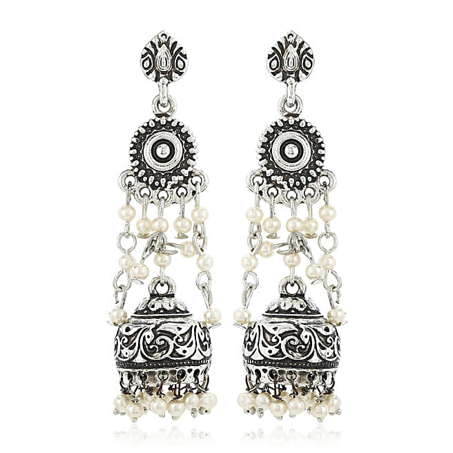 Estele Pearl Drop Oxidized Silver Jhumkas
