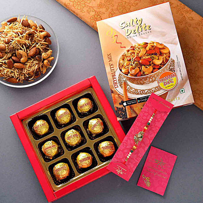 Ethnic Peacock Rakhi & Assorted Chocolates With Dalmoth