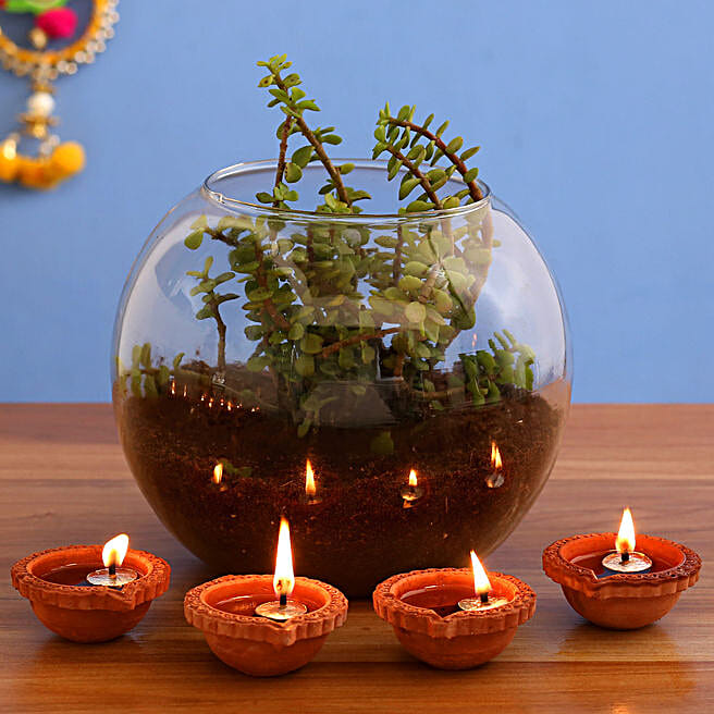Fantastic Jade Plant Terrarium 4 Earthen Diyas
