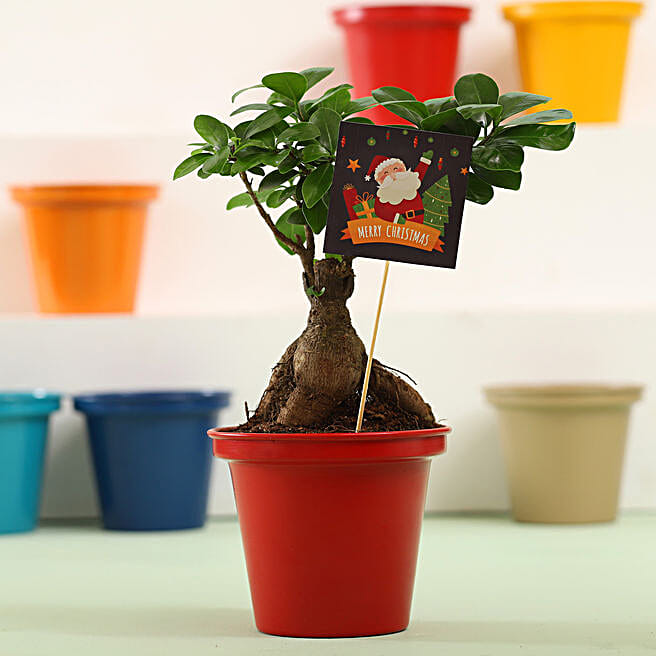 Ficus Bonsai In Red Metal Pot For Christmas