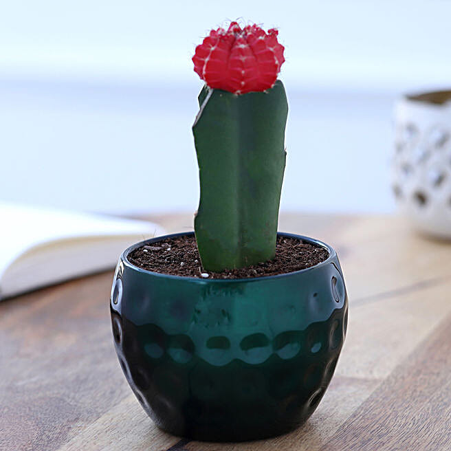 Flowering Cactus In Green Hammered Metal Pot