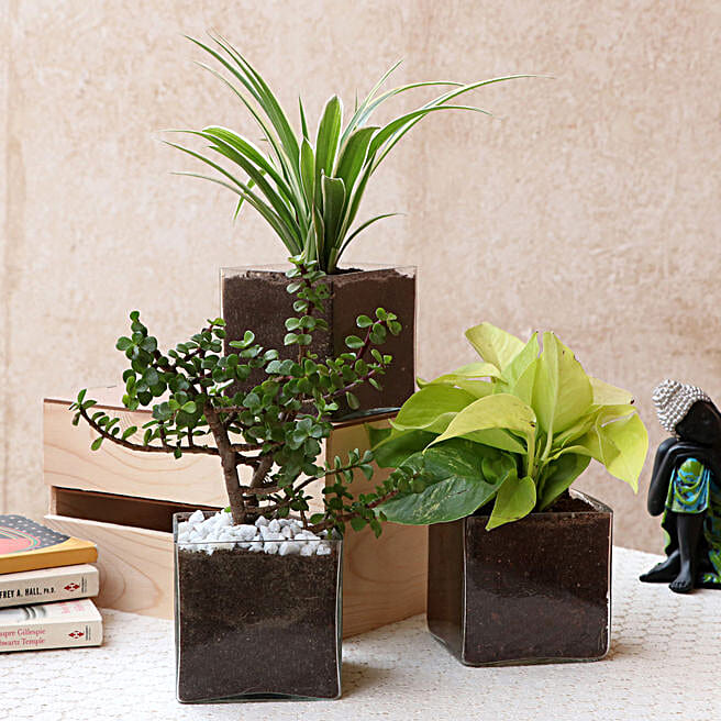 Three Beautiful Plants In Glass Square Vase