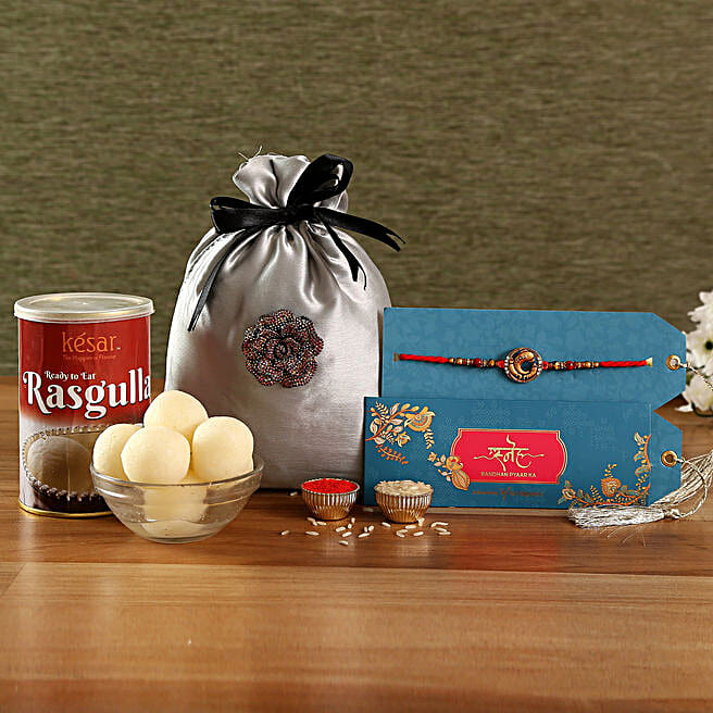 Ganesha Rakhi & Rasgulla In Premium Designer Potli