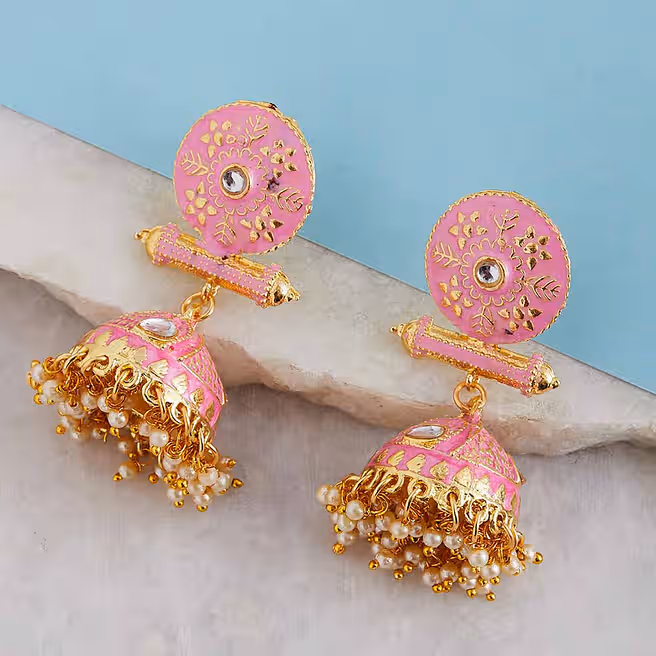 Gold-Toned Pink Meenakari Jhumkas