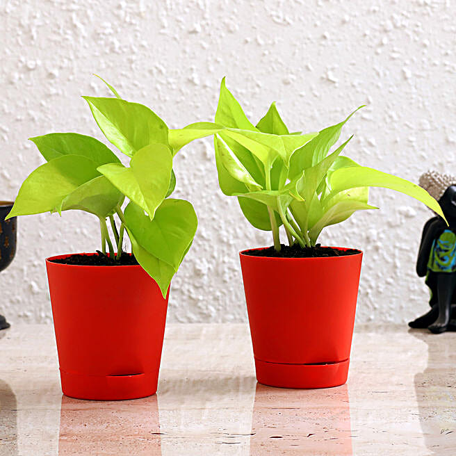 Golden Money Plant Duo In Red Self Watering Pots With Plates
