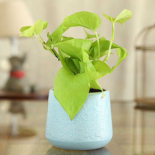 Golden Money Plant In Blue Flower Design Pot