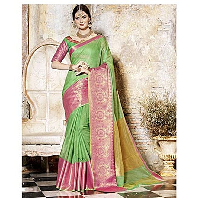 Green Blended Cotton Woven Festival Wear Saree