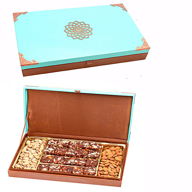 Green Wooden Hamper Box With Mithai & Dry Fruits