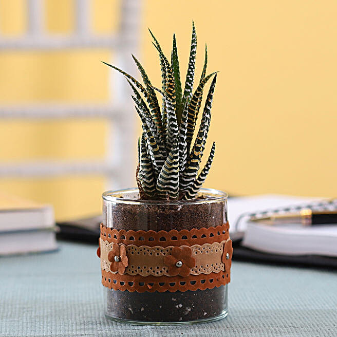 Howarthia Zebra Plant in Cylinder Glass Pot with Flower Lace