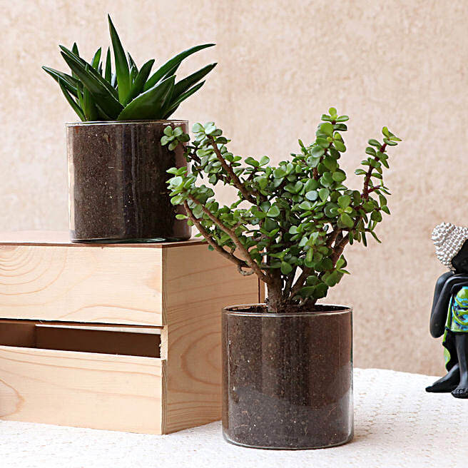 Jade & Mini Aloevera Plants Combo In Glass Vase